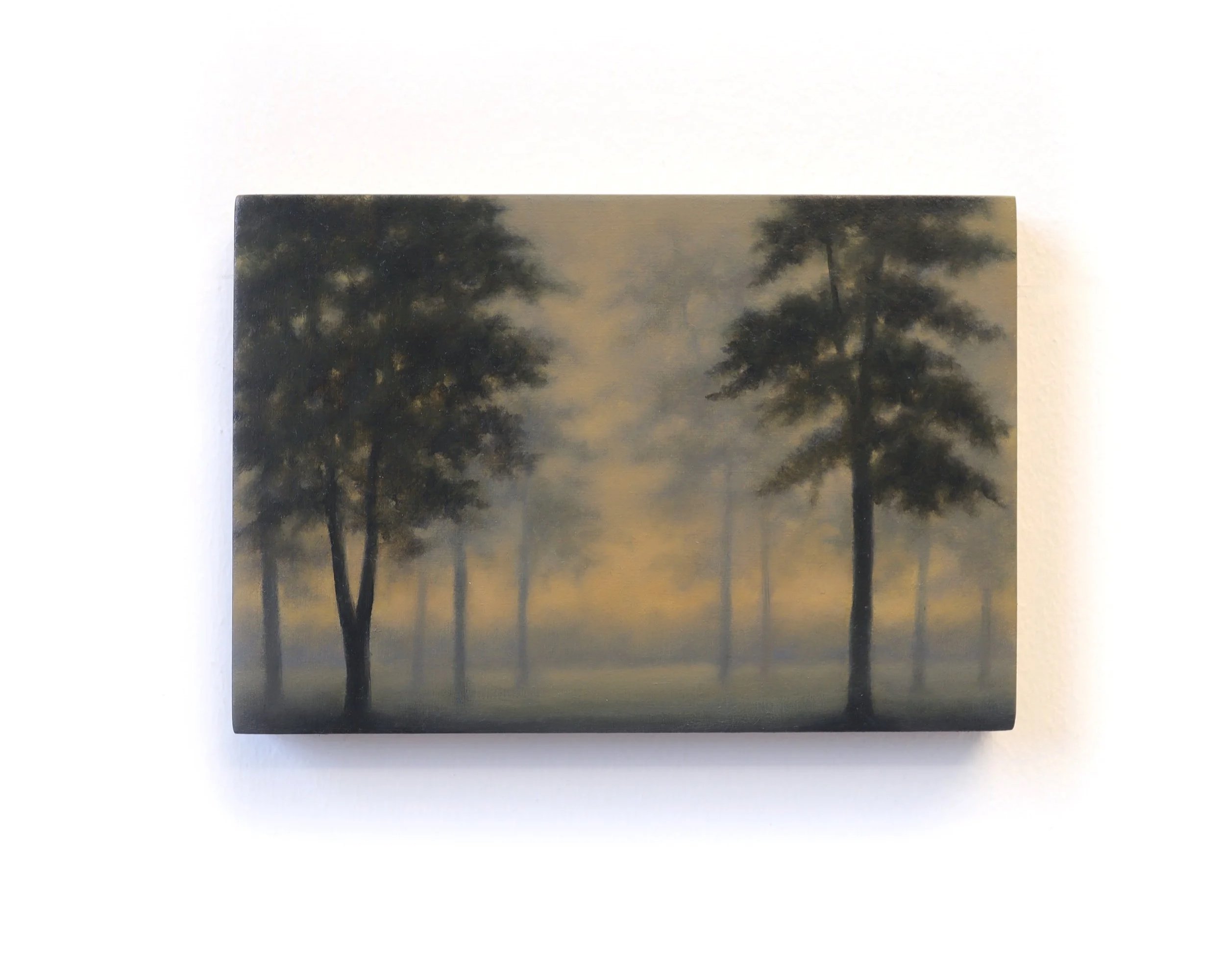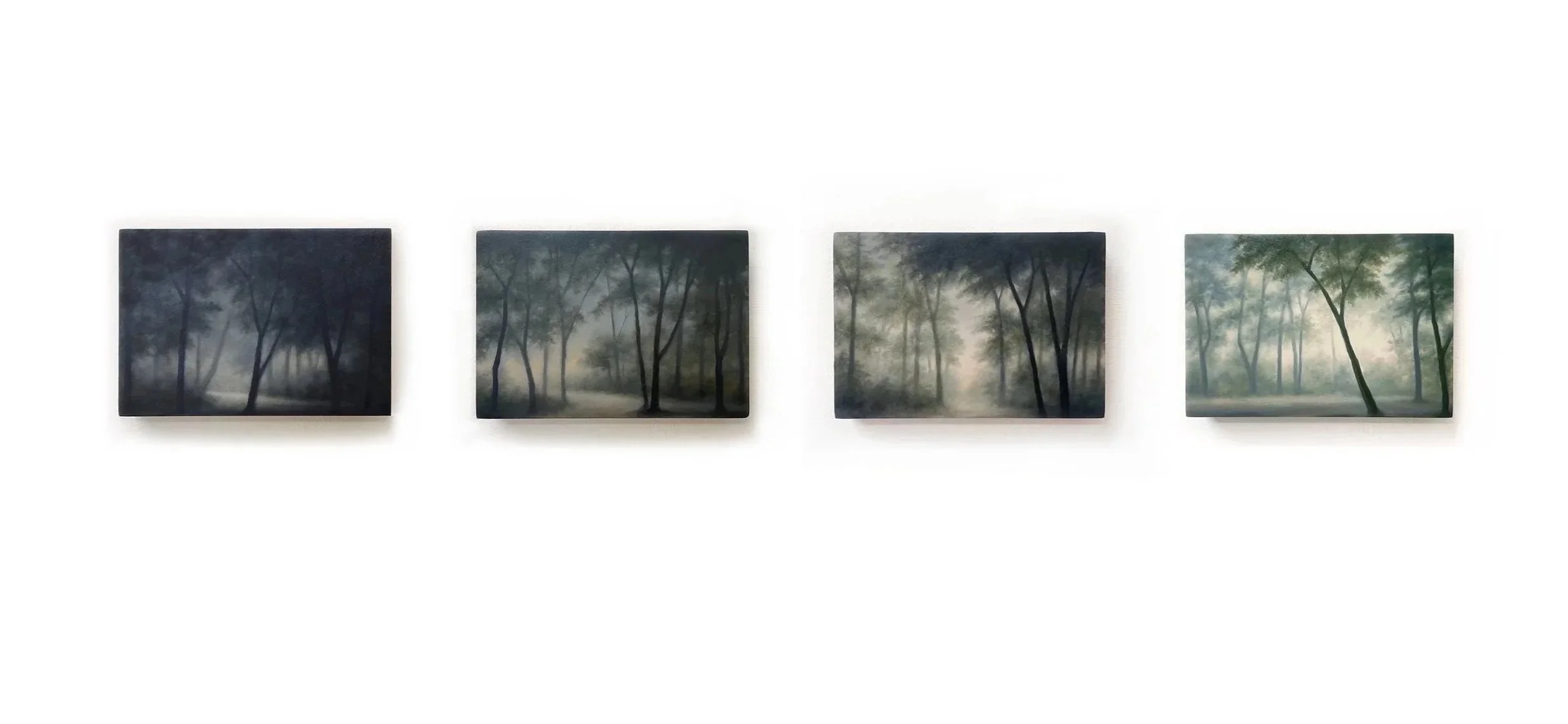 The Realm Series began in 2023 as a series of four small paintings which pictured light fading to darkness in an imaginary wood. As the series has progressed the almost monochromatic palette has gradually shifted and the rhythm of the series, still in groups of four, has become punctuated by sudden transitions in tone.